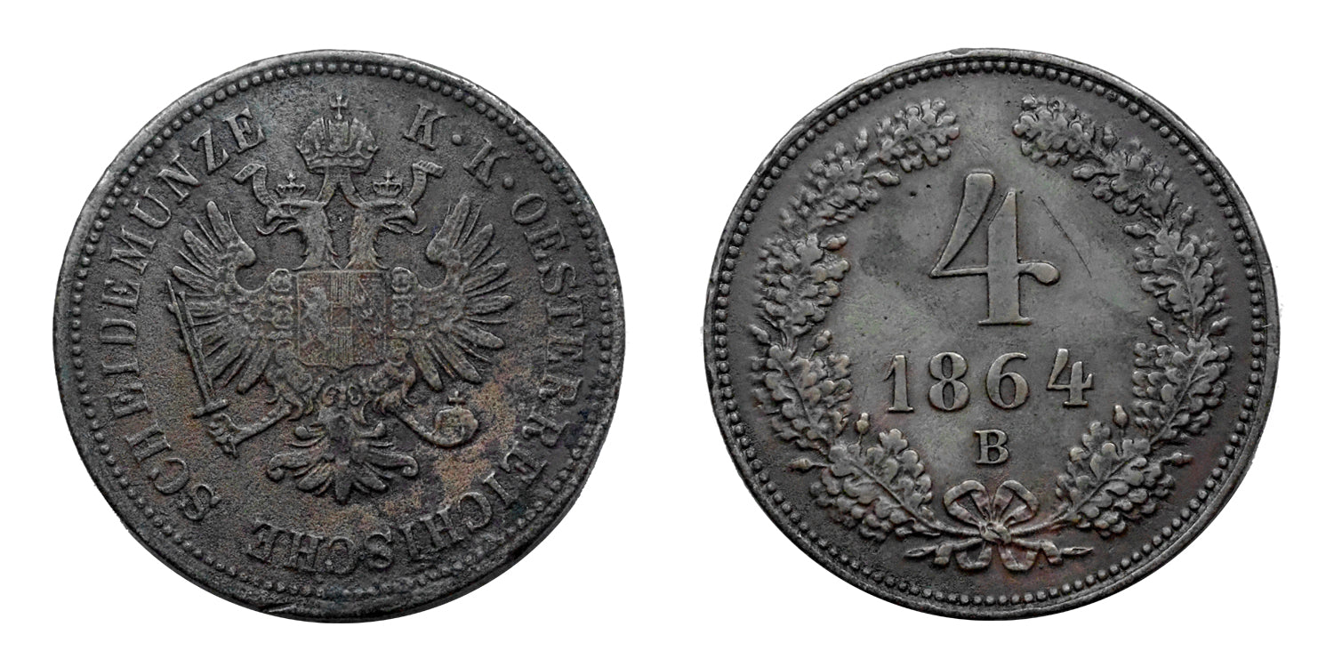 Leírás:Cu 4 krajcár 1864 B, 13.32gElõlap: Hátlap: Referencia:Éh 1479a, Huszár 2168 Tartásfok:gVF