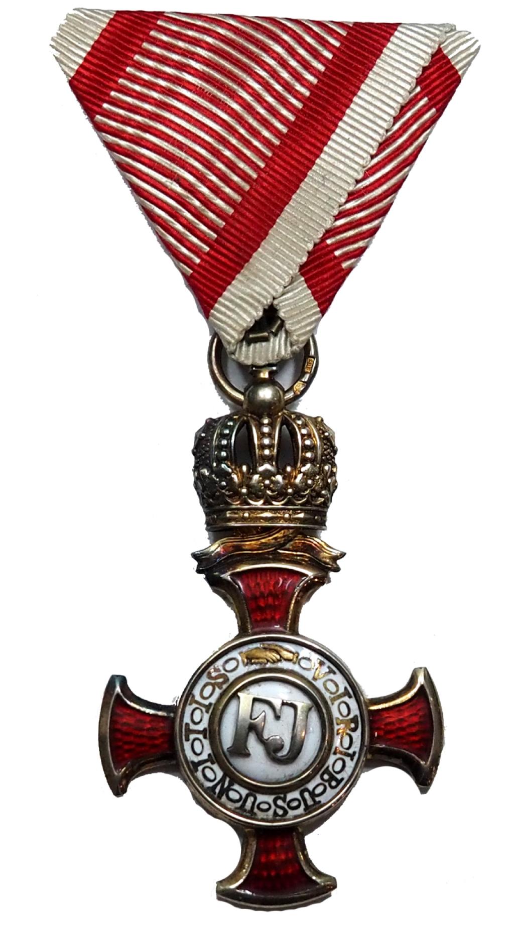 Koronás Arany Érdemkereszt a Vitézségi Érem szalagján