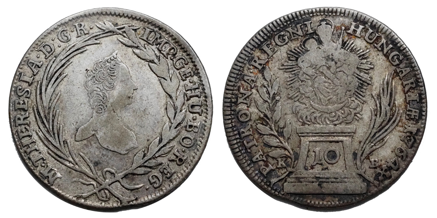 Leírás:Ag 10 krajcár 1764 KB, 3.75gElõlap: Hátlap: Referencia:Éh 1250, Huszár 1717 Tartásfok:VF