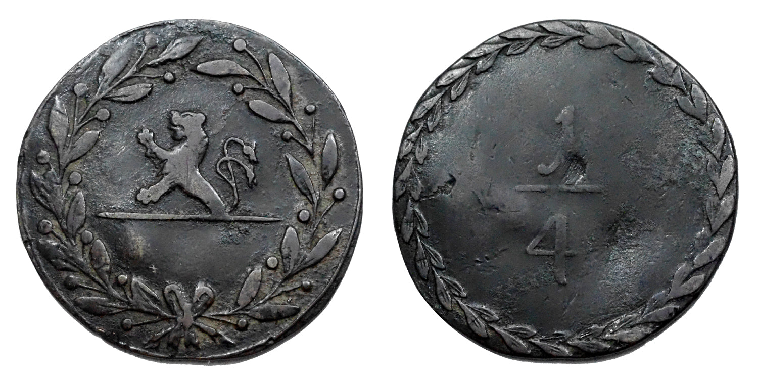 Leírás:Vukovár 1/4 étékû bárca, XIX.század. A vukovári uradalmat Eltz Anzelmo Kazimir gróf birtokolta a XIX.század elején. 2.90g, 23mmElõlap:Eltz család címere az oroszlánHátlap:1/4Referencia:Z SM-II. 3 Tartásfok:VF